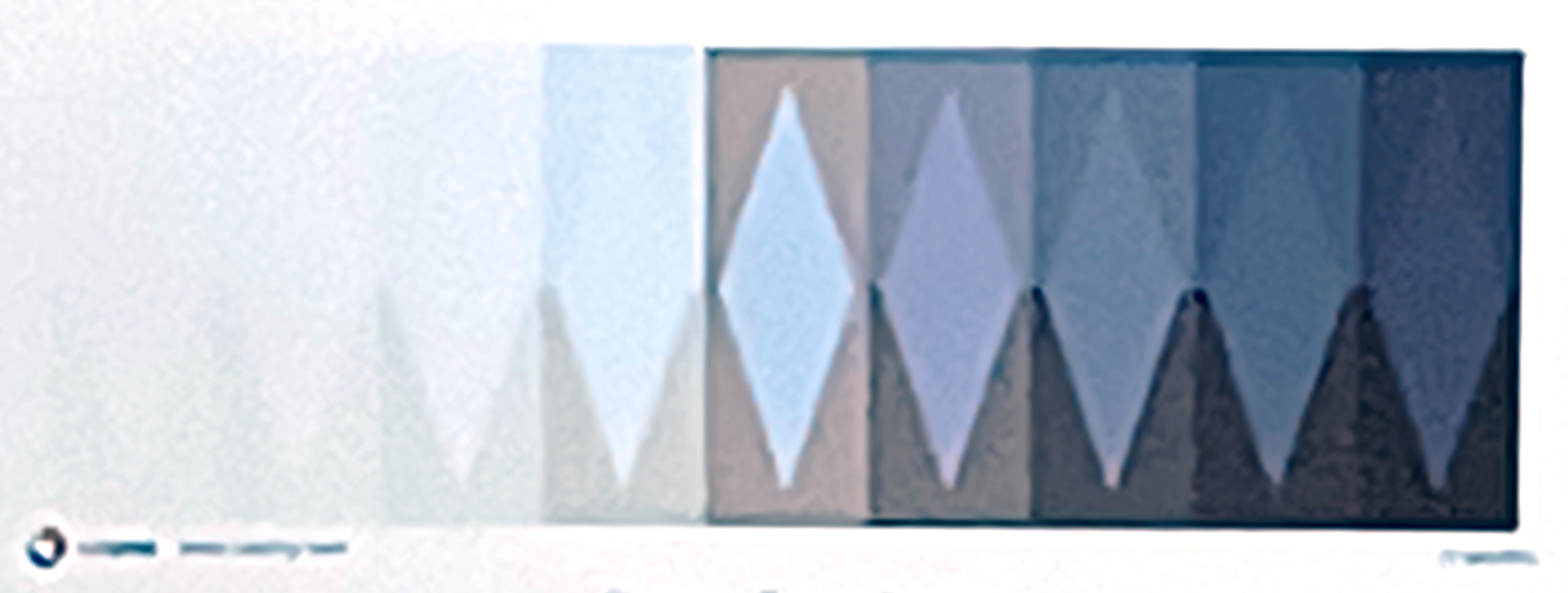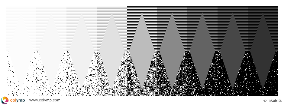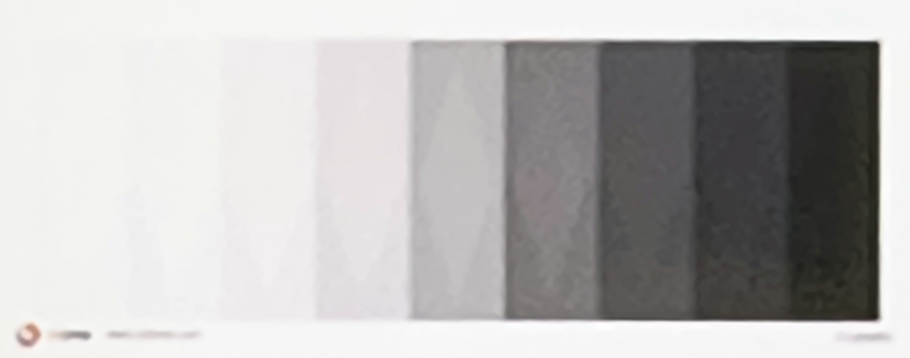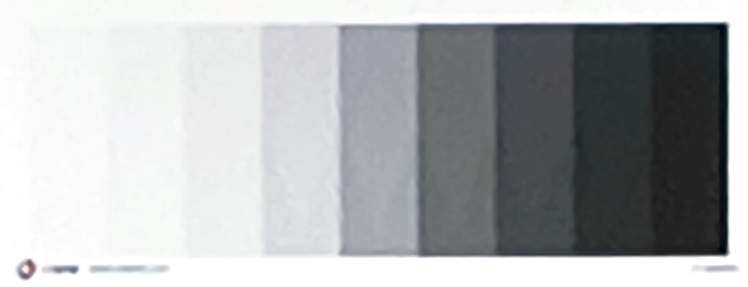 Die Grauwerte in den neun Rechtecken verlaufen nicht linear. Das Feld in Mitte ist genau 50% (RGB 188 188 188); rechts und links daneben 25% und 75%; dann 12,5% und 87,5%, u.s.w.